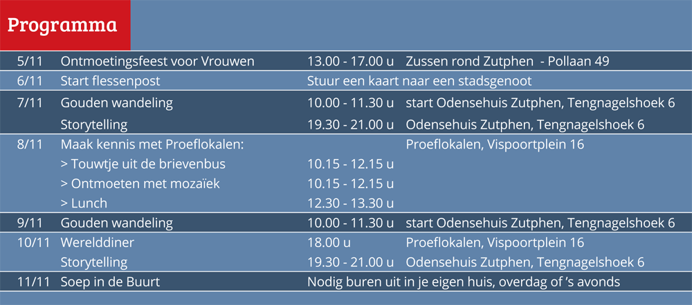 Hieronder het programma met alle activiteiten van dag tot dag met de locaties en de tijden. Klik hier om het programma te downloaden.